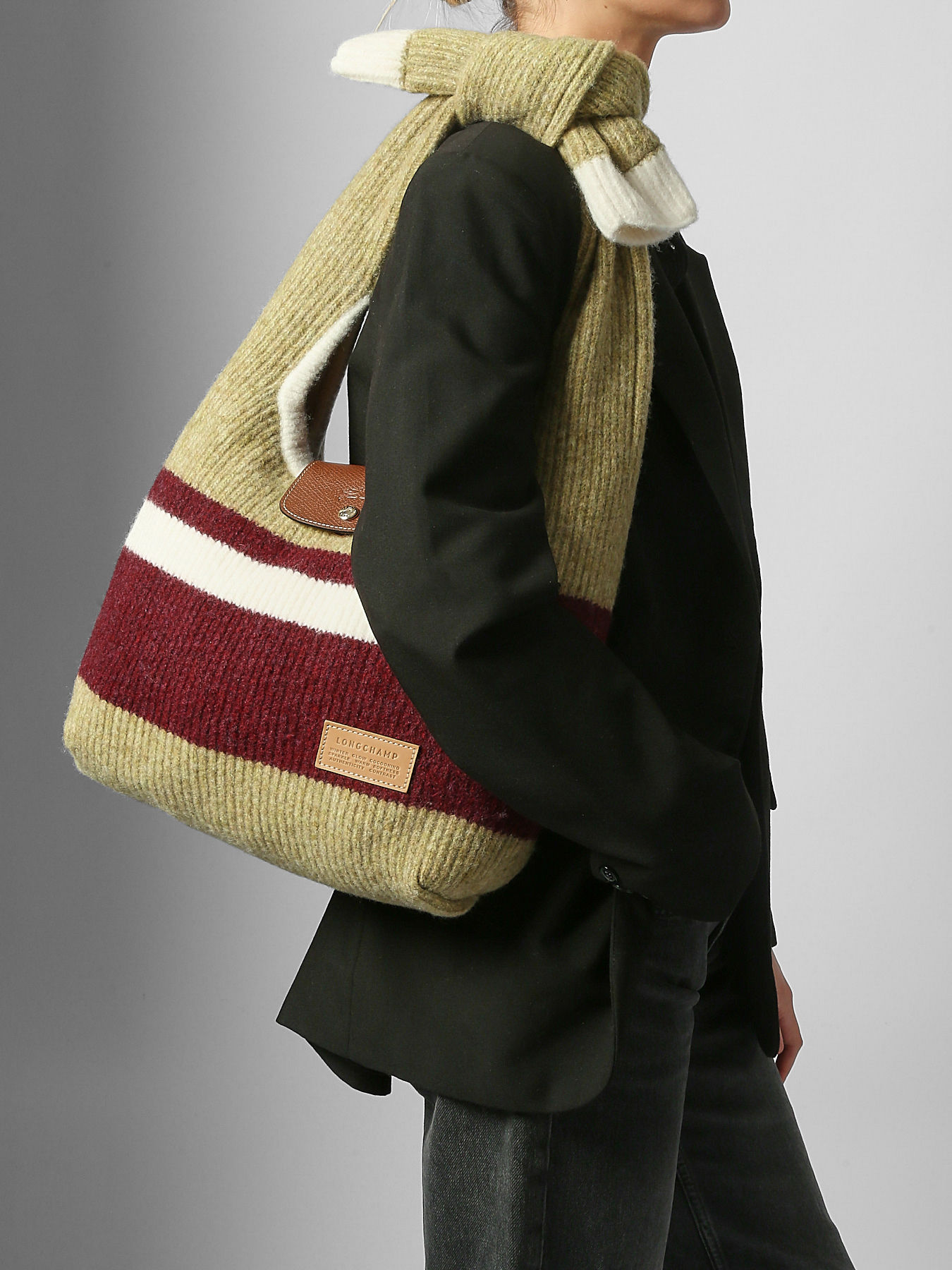 The Le Pliage Collection shoulder bag by LONGCHAMP is crafted from wool from the ready-to-wear collection, providing softness and warmth for the winter season. This hobo bag reinterprets the relaxed look of the classic Le Pliage with a knitted texture reminiscent of a colorful sweater draped over the shoulders. Enhanced with iconic Russian leather details, it combines finesse and style. The snap button closure ensures practicality and security, while the interior features a single compartment and a patch pocket to organize your essentials. The 20 cm handle height allows comfortable shoulder wear. True to the Le Pliage spirit, this model embodies enveloping elegance and creativity, offering a functional yet refined accessory to accompany a dynamic, modern lifestyle.